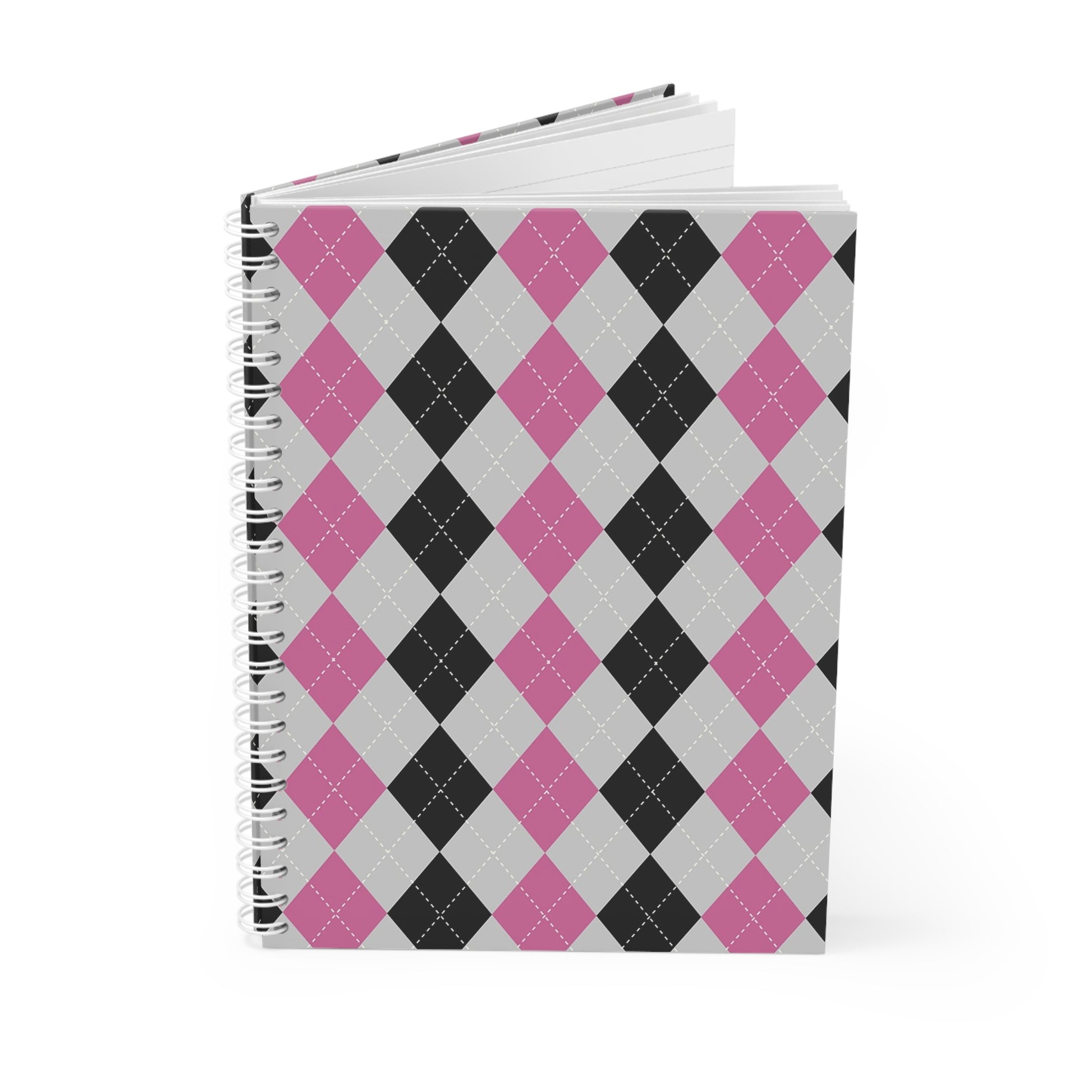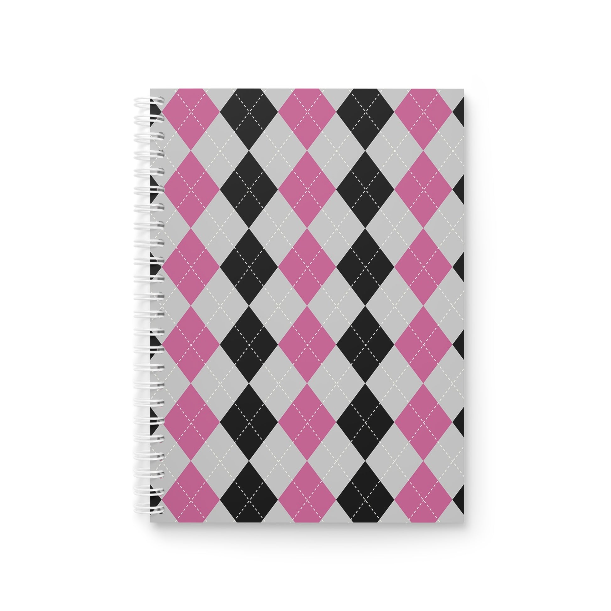 A compact spiral notebook that brings thoughtful charm to everyday notes. The semi-gloss laminated cover shows a crisp argyle pattern in rose, gray, and black with a simple emblem and understated text — a look that feels both playful and composed. Inside, 128 ruled pages of smooth 90gsm paper take pen, pencil, and gel ink without bleedthrough. The white metal spiral lets pages turn smoothly and removes sheets cleanly when you need to hand someone a page or reorganize your notes. Carry it to study sessions, planning afternoons, or quiet coffee-shop hours — it settles into a routine of lists, sketches, and small, steady ideas.